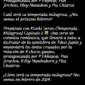 🎊 Kiseki Series (Temporada Milagrosa) ⛩️ Una serie de comedia romántica, que llevará a todos a disfrutar de la atmósfera de Tokio Japón y mantendrá los dedos cruzados por la relación de 4 chicos guapos, protagonizada por P Ekkapop, Pan Jirachot, B-Boy Nanthakorn y Plai Chattrin.